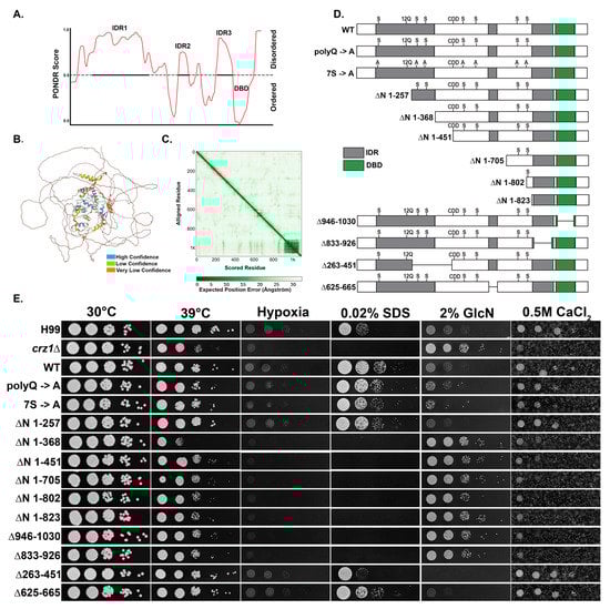 The Crz1 protein contains a C-terminal DNA binding domain (DBD) which makes up less than 10% of the protein sequence, and several intrinsically disorder regions (IDRs) predicted by PONDR [24] (Figure 5A). Consistent with this domain prediction, AlphaFold software predicts one defined domain in the Crz1 protein sequence which corresponds to the DBD, and no other inter-protein interactions in the remaining sequence [25,26] (Figure 5B,C). The near N-terminal disordered sequence also contains a poly glutamine (polyQ) track which may contribute to granular localization [27,28]. In addition, seven serine phosphorylation sites which are known to be dephosphorylated by calcineurin add an additional layer of Crz1 regulation [21]. To identify what regions of the Crz1 protein sequence are important for its localization and function in response to different stresses, we created 10 internal (Δ) and N-terminal (ΔN) truncated Crz1 mutant alleles, as well as a polyQ mutant Crz1(polyQ→A) (Figure 5D). We also utilized the existing phosphorylation site mutant Crz1(7S→A) [21]. We then tagged these mutant proteins with mNeonGreen and introduced them into the crz1Δ mutant background to test for functional complementation. To minimize variations on gene expression caused by positional effects, we integrated all the constructs into the same “safe haven” SH2 genetic locus [19,20]. For comparison, we also introduced the WT Crz1 protein sequence tagged with mNeonGreen into the crz1Δ mutant background using the same procedure. All Crz1 WT and mutant alleles were tested for (1) their ability to compensate for the loss of Crz1 in terms of growth in high temperatures, hypoxia, and media supplemented with calcium, Congo red, SDS, and glucosamine (Figure 5E) and (2) their subcellular localization in response to the various stresses (Table 1). For subcellular localization, a total of 100 cells were counted for each condition, and the percent of cells showing nuclear localization (as opposed to cytosolic), or granular localization are recorded in Table 1. Supplementary Figure S1 shows an example of cytosolic, nuclear, and granular localization of Crz1-mNeongreen.