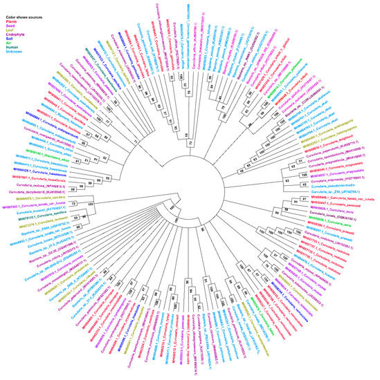 The Cochliobolus, Curvularia, and Bipolaris genera belong to the phylum Ascomycota, class Dothideomycetes, order Pleosporales, and family Pleosporaceae. The taxonomy of Cochliobolus has become rather confusing as a result of the numerous nomenclatural changes that have occurred in the sexual and asexual stages of species during the past few decades. For mycologists and plant pathologists, frequent name changes and taxonomic revisions have produced some confusion [15]. Because many Curvularia species share similar features and have overlapping conidial dimensions, identifying species merely based on morphology is challenging. Accurate and updated taxonomy of this genus and precise species identification are essential for disease control, plant breeding, and the implementation of National Plant Protection Organization (NPPO) measures. [33]. There are now 238 Curvularia species (excluding duplicated), 66 Cochliobolus species, and 142 Bipolaris species available in the MycoBank database (Table S1). Previously there were 81 recognized species for which DNA barcodes have been used to establish taxonomic placement, allowing for reliable identification and comparison [16]. The evolutionary relationships of Cochliobolus, Curvularia, and Bipolaris [34] have determined phylogenetic analyses using rDNA internal transcribed spacer (ITS) regions and glyceraldehyde 3-phosphate dehydrogenase (GAPDH), large subunit (LSU), and translation elongation factor 1-α (TEF1) gene sequences. Additionally, the use of molecular phylogenetic analysis based on multiple loci as a tool to identify novel species has increased [35,36]. The asexual genera Bipolaris and Curvularia lack a distinct morphological borderline, and some species exhibit intermediate morphology. Here, we retrieved the ITS sequences of those species from the NCBI database that may be involved in promoting plant growth, producing metabolites, biological control, symbiotic associations, and biotransformation. The substrate and source (host) information was retrieved from the Westerdijk institute of the Fungal Biodiversity Culture center (https://wi.knaw.nl, accessed on 15 April 2022). All the sequences were aligned to each other using ClustalX v. 1.83 [37]. Phylogenetic analyses were performed using MEGA X [38], and the maximum likelihood (ML) method based on the Tamura-Nei model, as reported previously [39], was used to construct the phylogenetic tree. The robustness of branches was assessed through the use of bootstrap analyses of 1000 replicates. The findings revealed that several Bipolaris species formed clades with Curvularia species (Figure 1, Table S2). The species isolated from different source are clustered together. The endophytic Curvularia species are clustered with other species relevant to biological control. However, there is no obvious difference between Curvularia and Bipolaris species in terms of their functioning based on the ITS region.