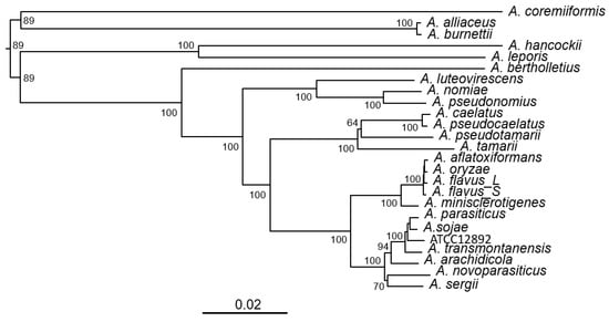 Phylogenetic tree of twenty-four Aspergillus section Flavi species inferred from KA gene cluster sequences using NJ analysis. A total of 5776 conserved sites (i.e., concatenated sequences of total SNPs) from each species were used. Bootstrap values are shown at the nodes. The branch length scale is shown. Branch lengths represent genetic change; the longer the branch, the more divergence has occurred. The exact species name of ATCC12892, originally designated as A. oryzae, is not known.