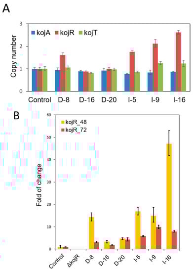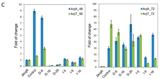 A. flavus gpiA (previously named AFLA_113120 and now as AFLA_007250 in FungiDB, https://fungidb.org/fungidb/app/), an orthologue of Saccharomyces cerevisiae ecm33, is a highly expressed gene [24,25]. An analysis of RNA-Seq reads related to this gene indicated that a 1.4-kb region, including the 5′ UTR, contained its promoter. A PCR fragment of the specified region was generated with primers GPI-H and GPI-Not (Table S1) to replace the gpdA promoter of pHgpdA-trpC-PTR to give pHgpiA-trpC-PTR. The vector had a unique NotI site and a unique SmaI site. Lastly, the full-length A. flavus kojR coding sequence was PCR amplified and cloned. The complementation vectors were individually transformed into the ∆kojR#4 mutant. Three KA-producing transformants from the A. nidulans gpdA promoter set (D-8, D-16, and D-20) and the A. flavus gpiA promoter set (I-5, I-9, and I-16) were selected based on visual inspection showing high levels of KA production (Figure S1). Their kojR copy numbers were determined, and they were used in a time-course expression study to examine how the restoration of kojR expression affected the expression of kojA and kojT.