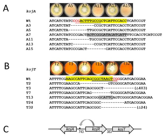 Identification of KojR-binding site in A. flavus kojA promoter. (A) Six indel defects in the motif of kojA, 5′- CGACTTTGCCG-3′, rendered the transformants unable to produce KA. (B) Six indel defects disrupted the identified motif of kojT, 5′-CGGCTAAGTCG-3′. However, they did not affect KA production of the transformants. The recipient strain used for the CRISPR/Cas9 work is wild-type A. flavus CA14. Wt represents wild-type sequences. Yellow-highlighted sequences are the target sites of the CRISPR/Cas9 complexes. Red trinucleotides CCG and CGG are protospacer adjacent motifs (PAM) that follow the regions targeted for cleavage by the Cas9 nuclease. Dash lines are deleted sequences. Gray-highlighted sequences are additional nucleotides inserted into respective motifs. The symbol ∆403 indicates a large deletion extending to the kojT-coding sequence (see Figure S3). The photos above the sequences are colony morphologies of six mutants on KAM agar plates, which are shown alternatively on their front and reverse sides. Colonies were grown at 30 °C for five days in the dark. Orange-red plates are KA-producing colonies. (C) Graphic representation showing the location of the functional KojR-binding site in the kojA and kojR intergenic regions inferred from the present study. The site is 266 nucleotides from the translation start codon of kojA and 466 nucleotides from the start codon of kojR.
