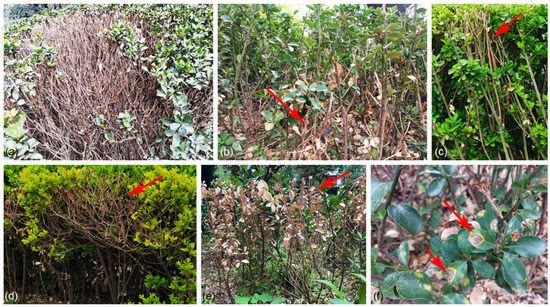 Diseased Euonymus japonicus in Beijing: (a–e) Symptoms of branches dieback; (f) Symptoms of leaf spots.