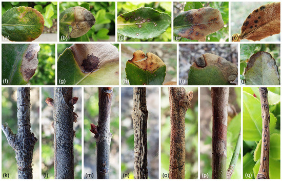 Different symptoms of the diseases of Euonymus japonicus: (a–j) Leaves spots with different symptoms; (k–q) Different morphological characteristics of reproductive structure on diseased branches.