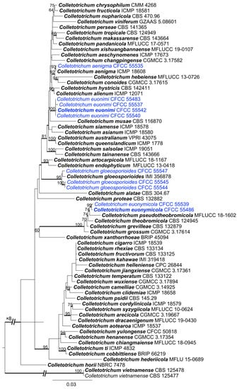 Colletotrichum is in Glomerellales, Sordariomycetes. The genus comprises 15 species complexes, i.e., the species complexes of Co. acutatum, Co. agaves, Co. boninense, Co. caudatum, Co. dematium, Co. destructivum, Co. dracaenophilum, Co. gigasporum, Co. gloeosporioides, Co. graminicola, Co. magnum, Co. orbiculare, Co. orchidearum, Co. spaethianum, and Co. truncatum [15,16]. Internal transcribed spacer region (ITS) is always used to assign Colletotrichum species to species complexes [16,17]. Liu et al. [16] combined ITS, act, chs-1, gapdh, his3, and tub2 sequences to construct a phylogenetic tree of Colletotrichum species. In addition, ITS, apn2, Mat1/Apn2, and sod2 sequences were combined in phylogenetic analyses of the Co. caudatum species complex, and ITS, act, chs, sod2, and tub2 sequences were combined in phylogenetic analyses of the Co. graminicola species complex [16]. Colletotrichum boninense, Co. gigasporum, Co. gloeosporioides, Co. griseum, Co. karsti, and Co. siamense have been recorded on host Euonymus [18,19,20,21,22].