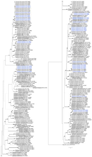 Phylogram of Cytospora based on maximum likelihood (ML) analysis of the dataset of combined ITS, act, rpb2, tef1-α, and tub2 genes. ML bootstrap support values above 70% are shown near nodes. Thickened branches represent posterior probabilities above 0.95 from BI. Ex-type isolates are in bold. Isolates highlighted with blue colours were obtained in this study.