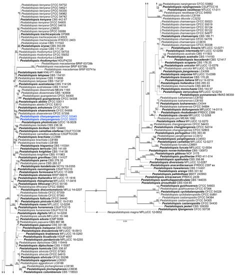 - Maharachchikumbura, S.S.N.; Guo, L.D.; Cai, L.; Chukeatirote, E.; Wu, W.P.; Sun, X.; Crous, P.W.; Bhat, D.J.; McKenzie, E.H.C.; Bahkali, A.H.; et al. A multi-locus backbone tree for Pestalotiopsis, with a polyphasic characterization of 14 new species. Fungal Divers. 2012, 56, 95–129. [Google Scholar] [CrossRef]