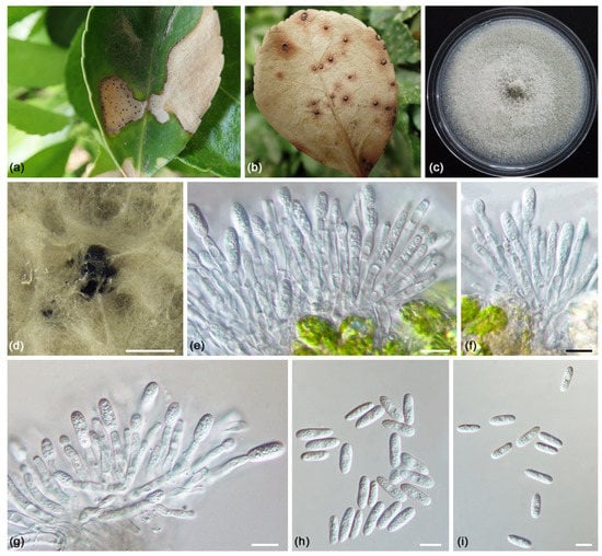 Colletotrichum euonymi (ex-holotype culture CFCC 55542): (a,b) Symptoms caused by Colletotrichum euonymi; (c) Front colony on PDA (10 d); (d) Conidiama on PDA (30 d); (e–g) Conidiophores and conidiogenous cells formed on inoculated Euonymus japonicus; (h,i) Conidia formed on inoculated Euonymus japonicus. Scale bars = 10 μm.