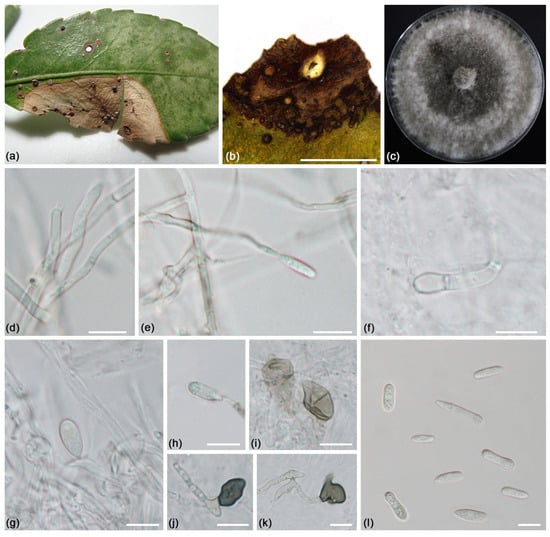 Colletotrichum euonymicola (ex-holotype culture CFCC 55486): (a,b) Symptoms caused by Colletotrichum euonymicola; (c) Front colony on PDA (10 d); (d–h) Conidiogenous cells formed on PDA; (i–k) Appiospora formed on PDA; (l) Conidia formed on PDA. Scale bars = 10 μm.
