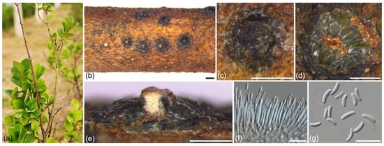 - Shang, Q.J.; Hyde, K.D.; Camporesi, E.; Maharachchikumbura, S.S.N.; Norphanphoun, C.; Brooks, S.; Liu, J.K. Additions to the genus Cytospora with sexual morph in Cytosporaceae. Mycosphere 2020, 11, 189–224. [Google Scholar] [CrossRef]