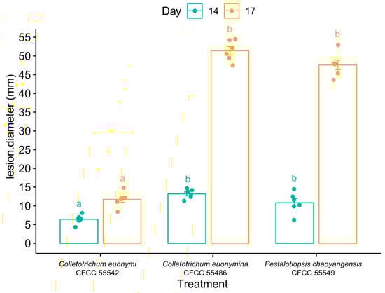 R 4.2.2 with the packages “ggplot2” [60] and “ggpubr” [61] was used to analyse pathogenicity data and output figure. Data were analysed using Tukey’s honestly significant difference (HSD) test (α = 0.05) by one-way analysis of variance (ANOVA).