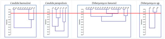 Dendrograms obtained from the RAPD-PCR of each yeast species by the UPGMA method (Jaccard distance). The red line shows a similarity level of 85%.