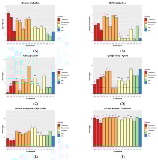 Different in vitro properties of the 16 yeast strains. (A) Biomass production (dry weight), (B) biofilm production, (C) autoaggregation at 1 h, (D) hydrophobicity, (E) electron acceptance, and (F) electron donation. The results are presented as the mean ± standard error. Different letters indicate significant differences (p < 0.05) between yeast strains of the same species. The dash line indicates the arbitrary criteria for the selection of yeasts.
