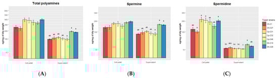 The polyamine concentration of the supernatants (extracellular) and yeast pellet cells (intracellular) of the 7 yeast strains was quantified (Figure 3). The cell pellets contained almost twice the concentration of polyamines (333.05 ± 75.94 ng mg−1 of dry weight) as the supernatants (180.07 ± 145.80 ng mg−1 of dry weight) (Figure 3A) (p < 0.001). In the cell pellets, there were no significant differences between yeast strains, while in the supernatants, D. hansenii C10 was shown to have a higher concentration than C. haemuloni C01 and C. parapsilosis C32 and C46. Spermine concentration in cell pellets did not differ between yeast strains, while in the supernatants, D. hansenii C10 and C28 produced higher concentrations compared with C. haemuloni C1 and C. parapsilosis C46 (Figure 3B). For spermidine, C. parapsilosis C31, C32 and D. hansenii C28 showed higher concentrations than C. haemuloni C27 in the pellet cells. In the supernatants, D. hansenii C10 showed a higher concentration than C. parapsilosis C46 (Figure 3C) (Table S3).