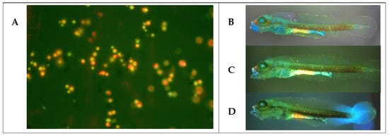 Yeast strains were observed in the intestines of cobia larvae after being inoculated by immersion with labeled yeast strains. (A) D. hansenii C10 stained with acridine orange (40×). (B) Cobia larvae (2 dph) after 1 h of being inoculated by immersion with stained D. hansenii C10, (C) C. haemuloni C27, and (D) D. hansenii C28 (4×).