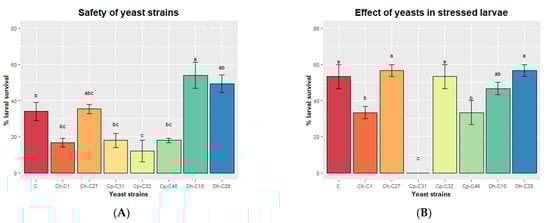 Effect of yeast strains on the survival of normal (A) and stressed larvae (B). (A) Larvae (2 dph) were exposed by immersion to yeast strains (107 CFU mL−1), and survival was monitored for 24 h. (B) Larvae (4 dph) were fed with rotifers (Brachionus rotundiformis) enriched with each yeast strain. At 6 dph, larvae were transferred to hyposaline water (5 ppt), and survival was monitored for 8 h. Data are presented as the mean ± standard error. Ch, C. haemuloni; Cp, C. parapsilosis; Dh, D. hansenii; Dsp, Debaryomyces sp.; Nsp, Naganishia sp. Different letters indicate significant differences (p < 0.05) with the control group of larvae being nonexposed to yeasts.