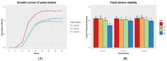 (A) Growth curves of selected yeast strains over 48 h at 28 °C and (B) viability of wet pellets of yeast strains stored at 4 °C at 0, 20, 50, and 65 dph (days post-harvest). Different letters indicate significant differences (p < 0.05).