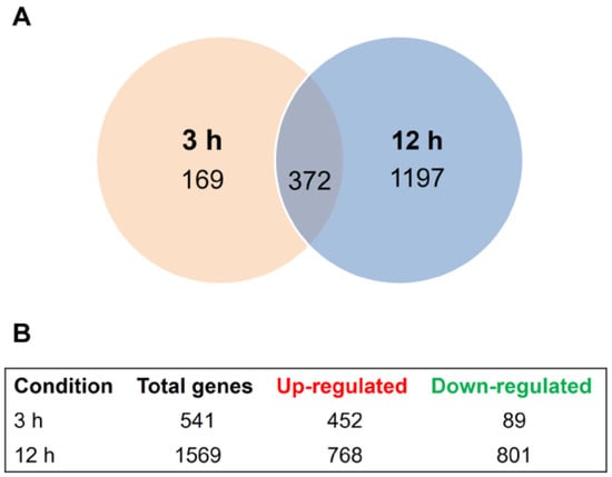 SRT-induced differential gene expression. (A) Venn diagram presenting the time-dependent differential expression of 1738 genes after exposure to sub-lethal dose of SRT for 3 h and 12 h compared to the control samples without SRT. (B) Total up- and downregulated genes in each experimental condition.