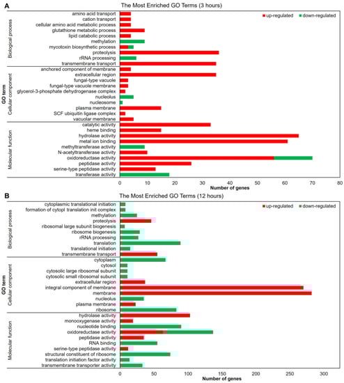 The functional categorization of the modulated genes was performed using Blast2Go, which revealed the molecular mechanisms by which T. rubrum senses and responds to the challenge of SRT presence (Figure 2). Gene function analysis using GO enriched mainly molecular function terms after 3 h of treatment. Genes associated with catalytic and hydrolase activities and those related to transmembrane transport were upregulated. The oxidoreductase activity induces or represses many genes after 3 h of drug exposure (Figure 2A). The upregulated membrane-associated genes and downregulated genes associated with the oxidation–reduction process increased at 12 h compared to those after 3 h of treatment. The terms related to translation were all inhibited at the 12 h time point. The number of genes associated with hydrolase activity and transmembrane transport increased compared to those in the 3 h condition, remaining induced in response to 12 h of SRT exposure (Figure 2B).