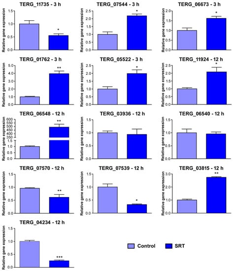Validation by RT-qPCR of 15 genes differentially expressed in response to SRT exposure. Log2 fold change at each time point represents gene expression level changes at each time point. Expression levels are relative to the control without SRT. Asterisks indicate the statistical significance determined by the t-test followed by Tukey’s post-hoc test (* p < 0.05; ** p < 0.01; *** p < 0.001). The identification of each gene is listed in Table 2.