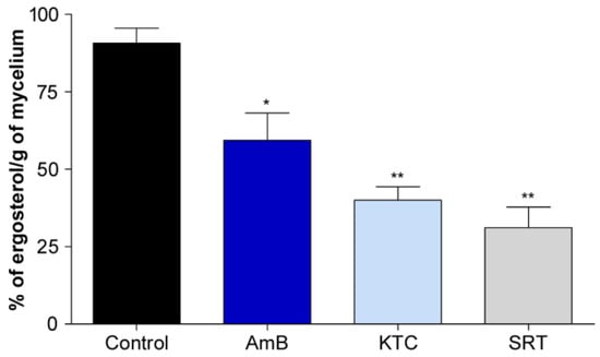 Effect of SRT on ergosterol content as a percentage of the wet weight of T. rubrum. Absence (negative control) and presence of amphotericin B (AMB, 1.25 µg/mL), ketoconazole (KTC, 4 µg/mL) (positive controls), and SRT (6.25 µg/mL). We tested the antifungals AMB and KTC at the minimal inhibitory concentration and the antidepressant SRT at a sub-inhibitory concentration. Asterisks represent statistical difference * p < 0.05 and ** p < 0.01 related to the control.