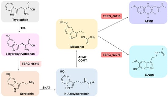 The biosynthetic pathway involved in synthesis of melatonin from tryptophan. Enzymatic steps from tryptophan to melatonin and the correlated metabolites. TPH: tryptophan hydroxylase; SNAT: serotonin N-acetyltransferase; ASMT: acetylserotonin O-methyltransferase; COMT: caffeic acid 3-O-methyltransferase; AFMK: N-acetyl-N-formyl-5-methoxykynuramine; 6-OHM: 6-hydroxymelatonin. The red genes are upregulated by T. rubrum in response to SRT. In pink, transcript accumulation is slightly below the log2 fold threshold (corresponding to 1.36 fold). Figure adapted from [36,37].