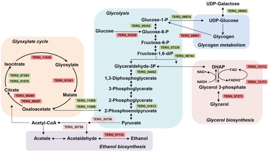SRT apparently interferes with the primary metabolism of T. rubrum. While genes involved in glycolysis are repressed, the genes involved in the glyoxylate cycle, ethanol and glycerol biosynthesis, and glycogen debranching are induced. The drug makes T. rubrum deviate from standard carbon metabolism to alternative pathways based on gene expression patterns (Figure 6). This repressive effect on glycolysis pathway genes counteracts the initial step performed by hexokinase (TERG_03229), which is induced. Metabolic reprogramming induced the expression of glyoxylate cycle-associated genes (TERG_11639, TERG_01281, TERG_08288, and TERG_08287) and glycerol biosynthesis genes (TERG_07273, TERG_12172, and TERG_12173). Additionally, SRT modulated ethanol- and glycerol-catabolism-related genes and induced a debranching enzyme (TERG_06681). This enzyme facilitates the breakdown of glycogen, which serves as a store of glucose.