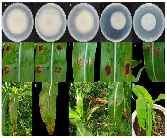 Pathogenicity assays. Five isolates caused spots consistent with symptoms in the field. (A–E) correspond to (a–e); (f–i) symptoms in the field; (j) control.