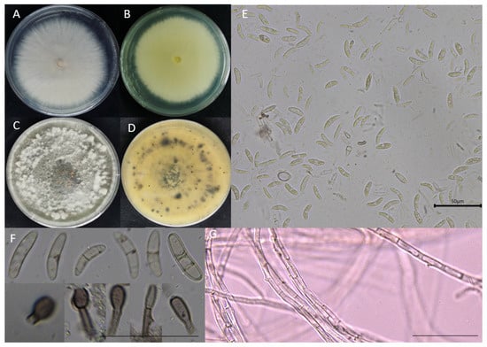 The morphology of mycelia and fungal spores grown on PDA medium for 14 days. (A,C) Front of the colony; (B,D) back of colony; (E,F) conidia and sporophore; (G) hyphae. The scale bars in Figure 2E–G are all 50 µm.