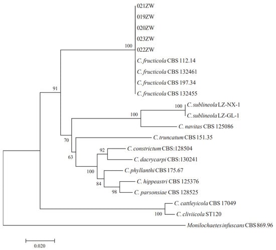The ITS–GAPDH–TUB2 phylogenetic tree. 019ZW, 020ZW, 021ZW, 022ZW, 023ZW, and C. fructicola clustered together.
