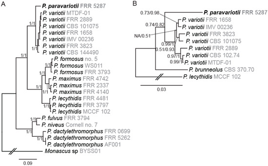 Phylogenetic analysis supports the separation of Paecilomyces strain FRR 5287 into a new species. (A) Nine-gene tree showing relationships among genome sequenced Paecilomyces strains. (B) Four-gene tree showing relationships among the P. variotii/paravariotii/brunneolus clade. Trees shown were generated in MrBayes. Branch supports indicate bootstraps from maximum likelihood analysis in MEGA-X (first number) and Bayesian probabilities from MrBayes (second number).