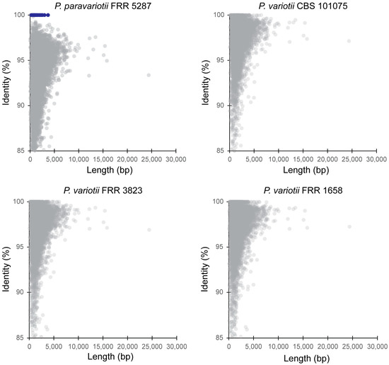 Given the separation between P. paravariotii and P. variotii in the phylogenetic analysis, we decided to assess the level of divergence between these species on a genome-wide scale. To do this, we took the gene annotations for P. variotii CBS 144490 (8168 genes), used this with BLAST against the genome of the species to be compared against, and then graphed the top hit for each gene on a plot of identity vs. length. As expected, this revealed greater divergence between P. variotii CBS 144490 and P. paravariotii FRR 5287 than between P. variotii CBS 144490 and other P. variotii strains (Figure 2).