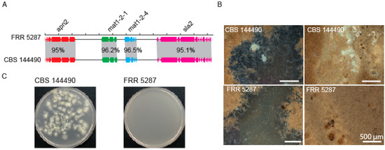 Strain FRR 5287 is reproductively isolated from P. variotii. (A) Diagram of mating type loci. (B) Ascomata production of mating plates. (C) Germination of ascospores following heat treatment of mating material; only the positive control yielded colonies.