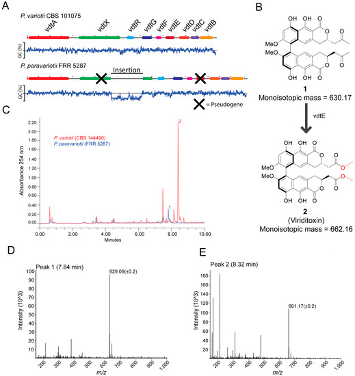 P. paravariotii strain FRR 5287 is unable to synthesis mature viriditoxin. (A) FRR 5287 has a mutated viriditoxin biosynthesis cluster in which vdtX and vdtE are pseudogenes. The % GC content across the DNA is graphed below the DNA region. (B) vdtE is responsible for the Baeyer–Villiger oxidation in viriditoxin biosynthesis; its absence leads to the production of compound 1 rather than viriditoxin 2. (C) HPLC-MS data showed the production of 1 in FRR 5287. The mass spectra for (D) compound 1 and (E) compound 2.