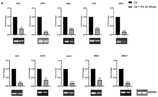 The morphological switching of C. albicans is also associated with altered virulence gene expression. When the C. albicans cell switches its morphology from the yeast form to pseudohyphal structures to hyphal structures, the expression of virulence-associated genes increases. Since the E. coli cell-free filtrate affected the growth, biofilm formation, and morphology of C. albicans, we determined whether this polymicrobial interaction also affected the virulence gene expression by using quantitative real-time (qRT) and semiquantitative end-point-PCR analyses (Figure 7A). The total RNA of the 5% E. coli filtrate-treated C. albicans was isolated, and the cDNA expression of the genes involved in morphogenesis (EFG1, CPH1, NRG1, TUP1, and HWP1) and the genes involved in adhesion and penetration (ALS3, ECE1, SAP3, ERG3, and ERG11) was determined [28,29,30]. In the planktonic interaction, the expression of all of these genes was mostly reduced, indicating that E. coli can affect the pathogenesis of C. albicans.
