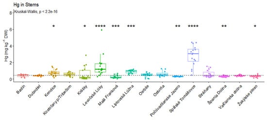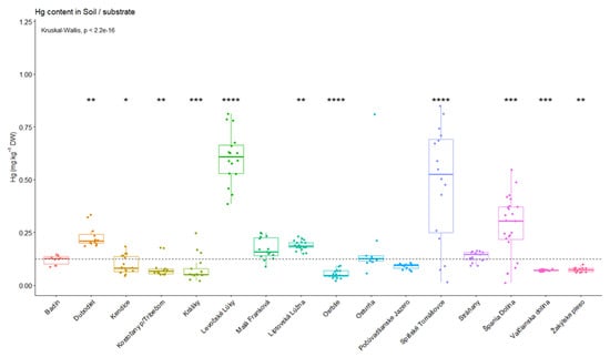 - Árvay, J.; Demková, L.; Hauptvogl, M.; Michalko, M.; Bajčan, D.; Stanovič, R.; Tomáš, J.; Hrstková, M.; Trebichalský, P. Assessment of environmental and health risks in former polymetallic ore mining and smelting area, Slovakia: Spatial Distribution and accumulation of mercury in four different ecosystems. Ecotoxicol. Environ. Saf. 2017, 144, 236–244. [Google Scholar] [CrossRef]