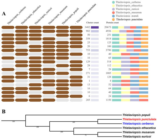 Orthologue gene clustering and phylogenetic analysis using predicted proteins of six Thielaviopsis species. (A). Orthologue clusters. Orthologue gene clusters were identified and visualized using the OrthoVenn2 web platform. The e-value cut off 1 × 10−10 was used for the analysis. (B). Phylogenetic tree of six Thielaviopsis species (T. populi, T. ethacetica, T. cerberus, T. euricoi, T. musarum, and T. punctulata) inferred from concatenated alignment of 50 shared orthologue proteins. The relationship was constructed by MEGA11 using the Maximum Likelihood method and JTT matrix-based model (based on 1000 bootstrap replications). The percentage of replicate trees in which the associated taxa clustered together in the bootstrap test are shown next to the branches.