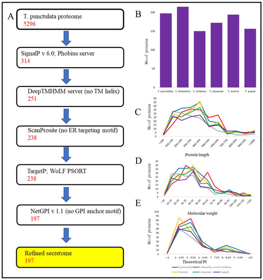 The methodology used to predict the secretome of T. punctulata is illustrated in Figure 2. Using a combination of SignalP and Phobius server, of the 5296 total proteins, 314 proteins were predicted to have a signal peptide at their N-terminal region. Among these 314 proteins, 63 transmembrane proteins were excluded, and the remaining 251 proteins were scanned for an endoplasmic reticulum (ER)-targeting signal to exclude the proteins that remain in the endoplasmic reticulum. Of the 251 proteins, 13 were predicted to have PS00014 ER motif and were excluded from further analysis. The remaining 238 proteins were predicted as “extra-cellularly localized” through TargetP and WoLF PSORT analysis. Next, of the 238 proteins, 41 proteins were predicted to harbor glycophosphatidylinositol anchor motifs using NetGPI (version 1.1), which likely represent surface proteins rather than secreted effectors and were excluded. This resulted in a list of 197 “refined secretome”, which is 3.7% of the whole predicted proteome of T. punctulata (Table 1). Using this method, the secretome of T. musarum, T. ethacetica, T. euricoi, T. populi, and T. cerberus were also predicted. Overall, the number of “refined” secretome in all six species ranged from 150 (T. cerberus) to 215 (T. ethacetica) (Table 1, Figure 2B).