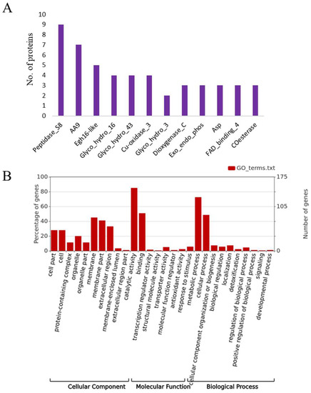 Functional domain and Gene ontology of secretome of Thielaviopsis punctulata. (A) Most enriched domains are shown in x axis, and y axis denotes the number proteins with respective domain. (B) Gene ontology annotation of genes based on domains present in the encoded proteins.