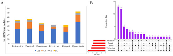 Overview of carbohydrate-activating enzymes (CAZymes) in T. punctulata and its closely related species. (A) CAZymes modules in T. punctulata and its closely related species. y axis denotes number different CAZymes modules. (B) Number of CAZY families shared between T. punctulata and its closely related species. Purple bar indicates the intersection. Red bar indicates the data size. Dots and lines connect the species with shared orthologues.