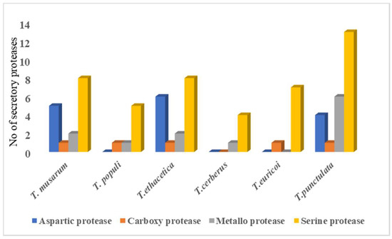 Several studies have shown that plant pathogenic fungi secrete proteases that degrade plant antimicrobial proteins and protease inhibitors (PIs) to facilitate virulence [59]. The BlastP search against MEROPS database resulted in the identification of 24 putative proteases from the 197 refined secretome, which were classified into several groups based on their catalytic residues (Supplementary Table S4). Among the proteases, serine proteases (13) were dominant, followed by metallo proteases (6), aspartic proteases (4), and carboxy protease (1). The serine proteases included S8, S10, and S28 families. Among these, S8 was found to be dominant (Supplementary Table S4). Members of metallo protease were further classified into M14, M28, M36, and M43 families based on their similarity to the known members from these families. Members of the same classes of proteases were also identified in the closely related species (Supplementary Table S4). Comparison to closely related species revealed that Serine protease S8 was prominent in T. unctulate, whereas S9 was completely absent (Figure 5).