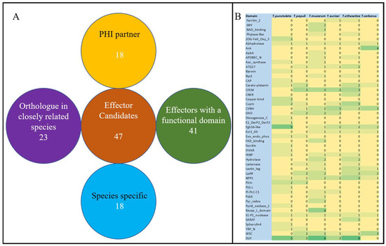 Putative effector proteins in the secretome of Thielaviopsis punctulata. (A) Overview: EffectorP identified a total of 47 putative effectors. Among these, functional domains were identified in 41 effectors. 18 putative effectors were identified as having a PHI partner, orthologues for 23 were found in the closely related species, and 18 were identified as species-specific. (B) Functional domains in the putative effector proteins of T. punctulata and closely related species. The number of domains of range 0–6 is represented by a golden to green color gradient.