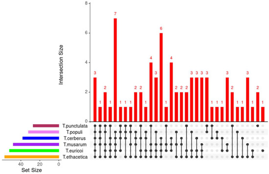 Orthologues of putative effector proteins in Thielaviopsis species. The number of orthologue genes shared by T. punctulata and its closely related species is shown as a red bar. The size of clusters in species is represented by different colors. Dots and lines connect the species with shared orthologues. The figure is generated by UpsetR.