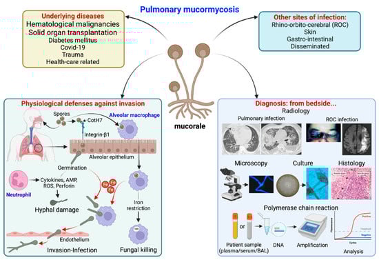 Summary of pulmonary mucormycosis: underlying diseases, sites of infection, physiological defenses against pulmonary invasion and diagnostic methods from the bedside. Physiological defenses in brief: alveolar macrophages can uptake Mucorales spores and restrict iron (Fe), which is essential for spore germination, resulting in spore persistence inside macrophages or their killing by defense mechanisms. On the other hand, integrin-β1 expressed on alveolar epithelial cells can recognize CotH7 on spores, facilitating spore internalization-germination. These germinating spores are recognized by neutrophils, which produce defensive molecules [cytokines, antimicrobial peptides (AMP), reactive oxygen species (ROS) or perforins] that result in hyphal damage. On the other hand, spores germinate in presence of Fe (both inside and outside macrophages) and invade endothelial cells resulting in invasion.