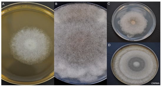 Macroscopic aspect of Mucorales. Incubation at 30 °C on 2% malt extract (MEA) or potato dextrose agar (PDA). (A) Lichtheimia ramosa on MEA at day 2. (B) Rhizopus microsporus on PDA at day 6. (C) Lichtheimia corymbifera on PDA at day 6. (D) Mucor velutinosus on PDA at day 6.