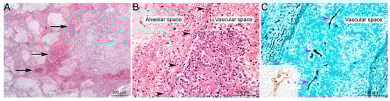 Histological lesions in pulmonary Mucormycosis. (A) Focal well-delineated lesion, centred on arteries and veins of medium calibre (black arrows), characterized by vascular alterations associated with peripheral alveolar oedema, acute hemorrhages, ischemic necrosis, and minimal inflammation (pulmonary infarction) (HE staining). (B) Higher magnification of vascular lesions: thrombi and destruction of vascular wall (black arrowheads), associated with alveolar hemorrhages, oedema and minimal inflammation (mostly neutrophils) (HE staining). (C) Hyaline, pleomorphic hyphae are detected in the lesions; very often invading vascular spaces (pink arrowheads). Hyphae are irregular in size (from 3 to 25 µm in diameter), folded, rarely septate (pauciseptate), branching (at right angles) with a ribbon-like morphology, and could be highlighted using Grocott’s Methenamine Silver staining, or immunohistochemistry (inset; primary antibody: GeneTex GTX39191; WSSA-RA-1). Used with kind permission from G. Jouvion. Reproduced from New developments in Mucormycosis, Semin Respir Crit Care Med 2015; 36: 692–705 (Publisher Georg Thieme Verlag KG).
