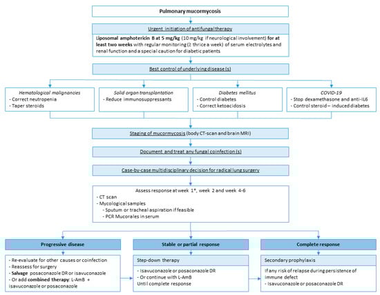 The initial treatment is based on L-AmB. The correction of risk factors, if feasible, is also a critical point, including control of DM, correction of neutropenia and ketoacidosis, and decrease of immunosuppressants. In COVID-associated mucormycosis, dexamethasone and anti-IL6, given for the viral disease, should be tapered or stopped if possible. Therapeutic response should be assessed by a lung CT scan after one, two and four weeks of treatment and by mycological samples on respiratory samples if feasible and serum PCR. Reevaluation at week 1 should be done with caution; a paradoxical worsening is possible after neutrophil recovery and should not be considered progression of the disease. The duration of the first-line therapy is at least two weeks but may require four weeks or more. After radiological stabilization or partial response, in association with negative mycological samples, step-down therapy with oral isavuconazole or posaconazole can be started. The duration of the treatment is highly variable but needs to be continued until complete clinical and radiological responses. Finally, secondary prophylaxis (i.e., maintenance or suppressive therapy) with oral azole should be discussed when there is any risk of relapse during persistence of immune defect including neutropenia, chemotherapy, or prolonged use of high-dose immunosuppressive therapy. Further studies are warranted to identify risk factors of relapse to better target patients who require prolonged maintenance therapy.