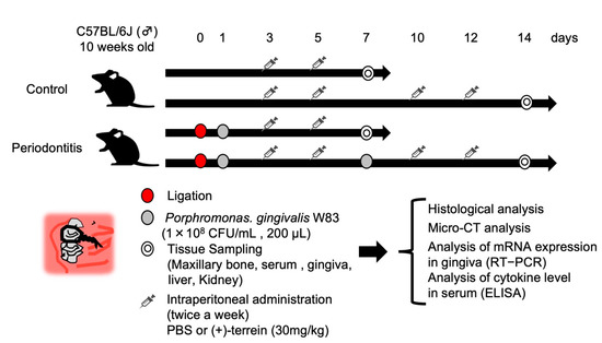 Twelve 10-week-old C57BL/6 wild-type male mice (Clare Corporation, Tokyo, Japan) were used to generate a mouse model of periodontitis using a partial modification of the method [21] (Figure 2). Briefly, mice were subjected to general anesthesia, and then 6–0 silk sutures were ligated to the cervical portion of the maxillary left second molar. The periodontal pathogen, Porphyromonas gingivalis W83 strain (1.0 × 108 CFU/mL; 200 μL), was then infiltrated into the silk threads to induce inflammation in the periodontal tissues. In addition, synthetic (+)-terrein (30 mg/kg) was administered intraperitoneally, and PBS was used as a negative control. The time schedule for each procedure (induction of periodontitis, administration of (+)-terrein or PBS, collection of the samples) is shown in Figure 2. Sixteen 10-week-old C57BL/6 wild-type male mice without ligature were used as the control and were treated in the same way as the periodontitis model (administration of (+)-terrein or PBS and collection of the samples).