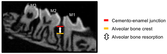 Quantitative method of alveolar bone resorption on micro-CT. Alveolar bone resorption was quantified by measuring the distance from the mesial cemento–enamel junction to the alveolar crest in the sagittal section of the maxillary left second molar on the micro-CT image. M1: maxillary left first molar, M2: maxillary left second molar, M3: maxillary left third molar.