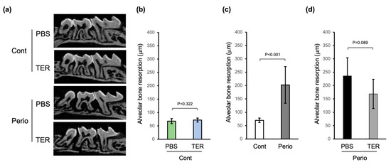 There was no statistically significant difference in alveolar bone resorption in the PBS-treated control mice compared to that in the synthetic (+)-terrein-treated control mice, confirming that synthetic (+)-terrein had no adverse effect on healthy alveolar bone (p = 0.322; Figure 4a,b). In the periodontitis mice, alveolar bone resorption was significantly increased compared to the control mice, confirming the induction of periodontitis by silk ligation with Porphyromonas gingivalis W83 infection (p < 0.001, Figure 4a,c). In addition, in the synthetic (+)-terrein-treated periodontitis mice, alveolar bone resorption tended to be suppressed compared to that in the PBS-treated periodontitis mice (p = 0.089; Figure 4a,d).