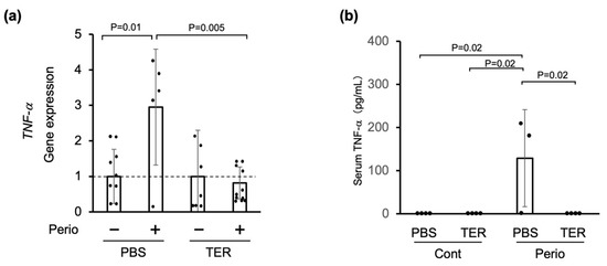 On the other hand, serum TNF-α was not found in either the PBS-treated or the synthetic (+)-terrein-treated control mice (Figure 6b). In the PBS-treated periodontitis mice, the serum TNF-α levels were significantly increased (p = 0.02; Figure 6b). In the periodontitis mice treated with synthetic (+)-terrein, the serum TNF-α levels were significantly reduced down to the uninduced periodontitis level (p = 0.02; Figure 6b).